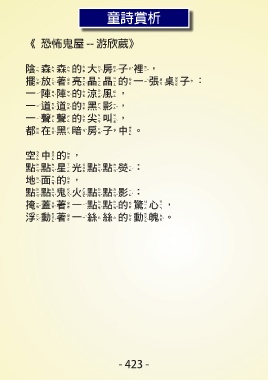 童詩賞析 《恐怖鬼屋 -- 游欣葳》 陰森森的大房子裡, 擺放著亮晶晶的一張桌子: 一陣陣的涼風, 一道道的黑影, 一聲聲的尖叫, 都在黑暗房子中。 空中的, 點點星光點點熒: 地面的, 點點鬼火點點影: 掩蓋著一點點的驚心, 浮動著一絲絲的動魄。 - 423 -