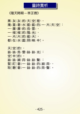童詩賞析 《陰天時期 -- 林芷微》 黑灰灰的天空裡, 掩蓋著水藍藍的一片天空: 一層層的烏雲, 一條條的陽光, 一片片的藍天, 都在水面照映中。 天空的, 絲絲烏雲絲絲光: 空中的, 絲絲細雨絲絲聲: 緊盯著一絲絲的細雨, 聆聽著一絲絲的雨聲。 - 425 -