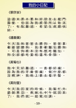 我的小日記 《蔡欣岑》 這週末原本要和好朋友去龍門 露營,但因為我感冒所以取消 了,有點難過,希望生病趕快 好。 《鍾嘉彌》 今天我和爸爸去餵狗。爸爸拿 著雞腿餵狗,我拿著麵包餵狗 。可是狗根本沒有想吃麵包, 狗全部都吃蛋糕還有骨頭。 《黃宥心》 我今天好難過,一直都好痛, 因為我的牙齒很痛,做什麼都 沒精神,我晚上要去看牙醫。 《黃昀萱》 今天我回家的時候,我幫忙外 婆剝黑豆,表姊也中午就回來 了,我們就一起寫功課。 - 59 -