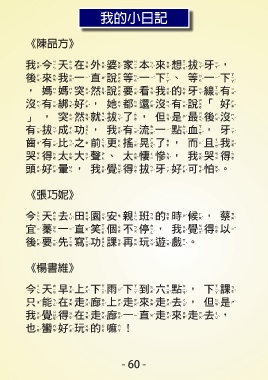 我的小日記 《陳品方》 我今天在外婆家本來想拔牙, 後來我一直說等一下、等一下 ,媽媽突然說要看我的牙線有 沒有綁好,她都還沒有說「好 」,突然就拔了,但是最後沒 有拔成功,我有流一點血,牙 齒有比之前更搖晃了,而且我 哭得太大聲、太悽慘,我哭得 頭好暈,我覺得拔牙好可怕。 《張巧妮》 今天去田園安親班的時候,蔡 宜蓁一直笑個不停,我覺得以 後要先寫功課再玩遊戲。 《楊書維》 今天早上下雨下到六點,下課 只能在走廊上走來走去,但是 我覺得在走廊一直走來走去, 也蠻好玩的嘛! - 60 -