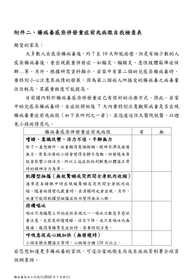 家長您好!近期腸病毒流行風險持續上升,請多加注意孩子的狀況。