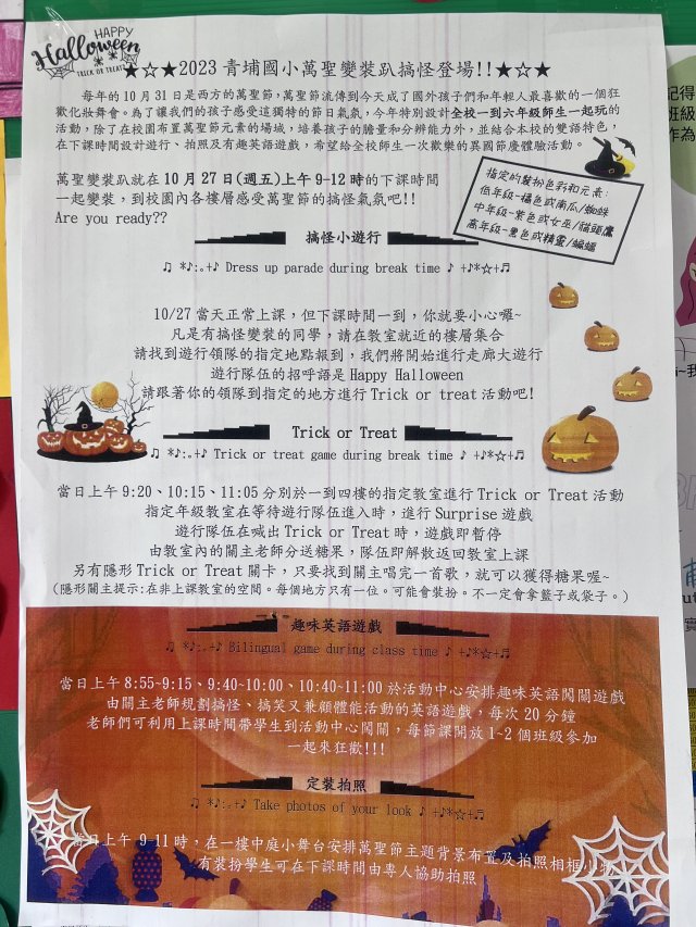 凡是有搞怪變裝的同學,請在教室就近的樓層集合請找到遊行領隊的指定地點報到,我們將開始進行走廊大遊行遊行隊伍的招呼語是 Happy Halloween