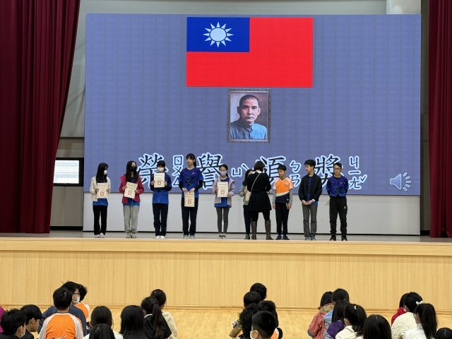 3月12日兒童朝會頒獎,604學生獲獎名單如下: 1、桃園市英語讀者劇場競賽佳作,獲頒獎狀及100元禮券: 林育陞、林忠緯、葉輔鈞、沈卉星、林以宸、許儷齡、陳孜語、謝君慧、蘇育潔 2、六年級硬筆書法比賽佳作: 林育陞、蘇育潔 3、在泰國舉行的全球樂高機器人競賽優等: 林忠緯 4、超越盃中文閱讀素養競賽特優獎、數學競賽傑出獎、自然競賽傑出獎:蘇育潔