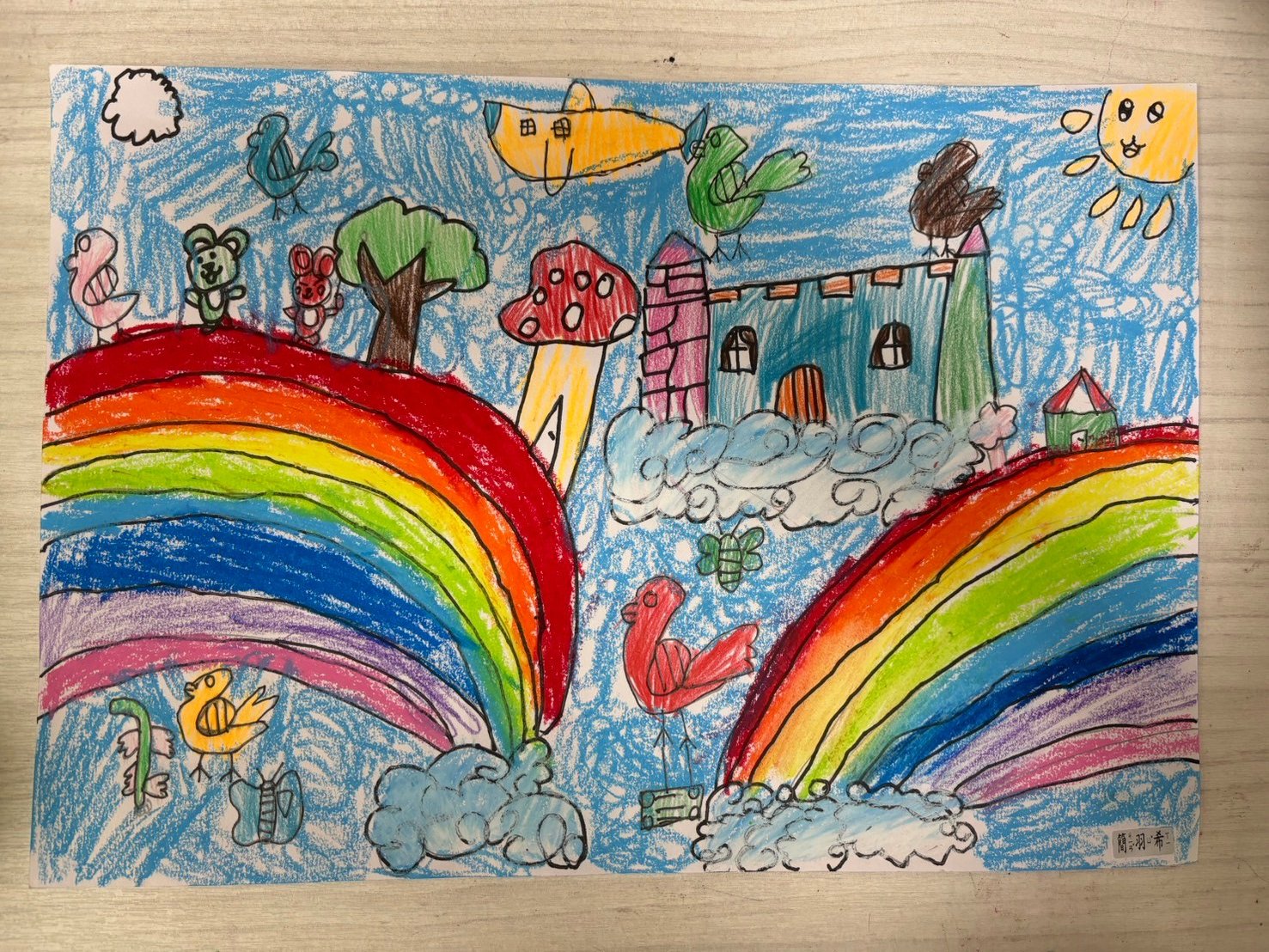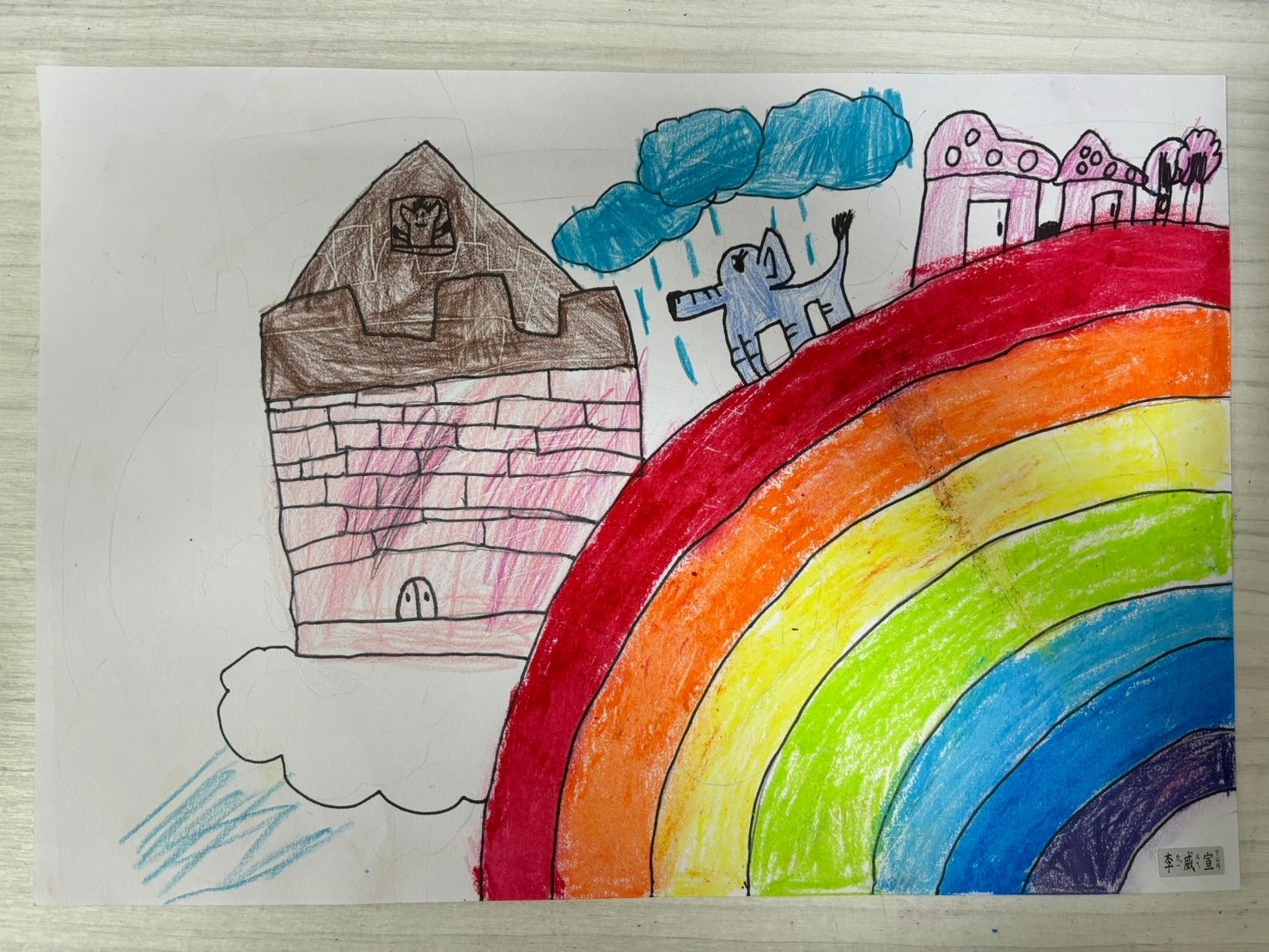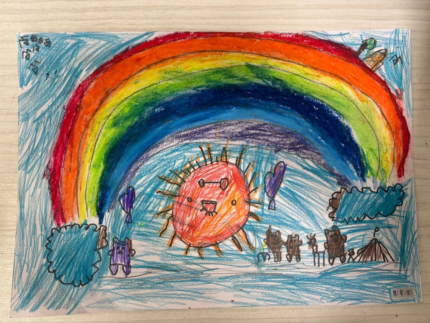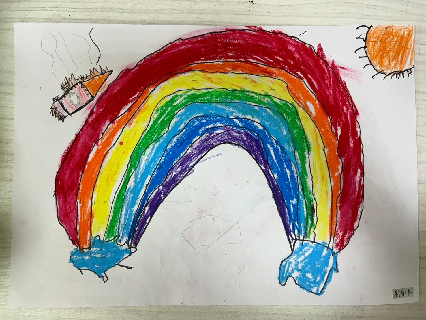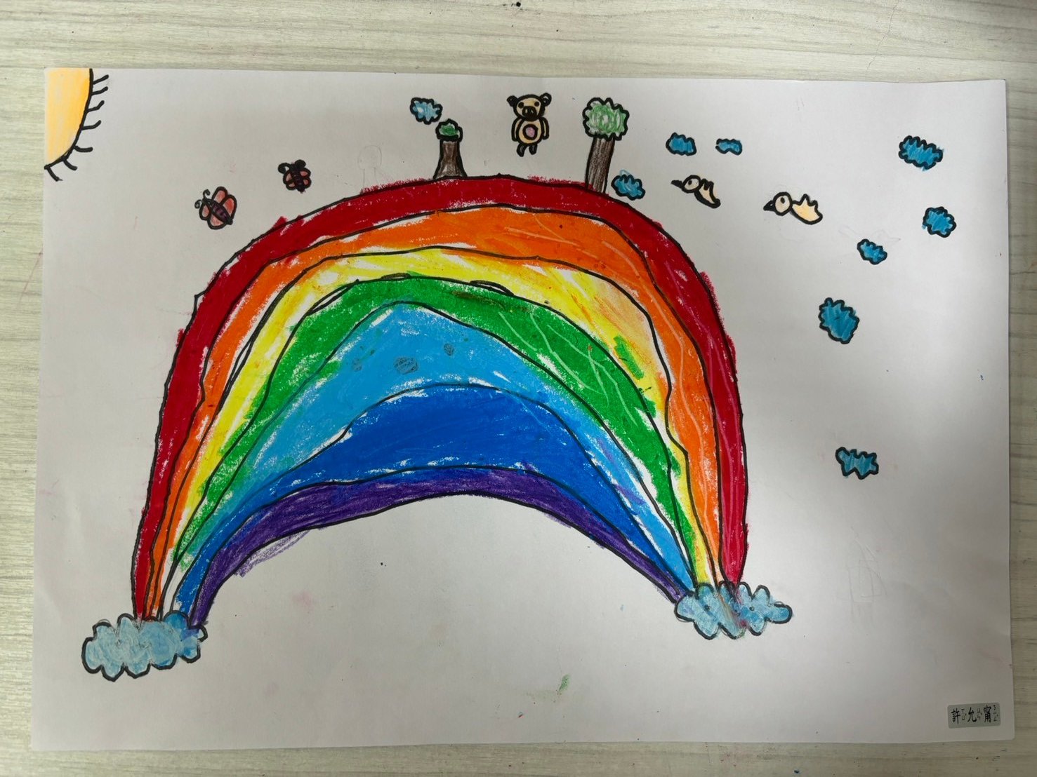 認識蠟筆的特性後,孩子這次運用蠟筆、色鉛筆和簽字筆完成一幅可愛的作品:充滿幸福感的彩虹畫