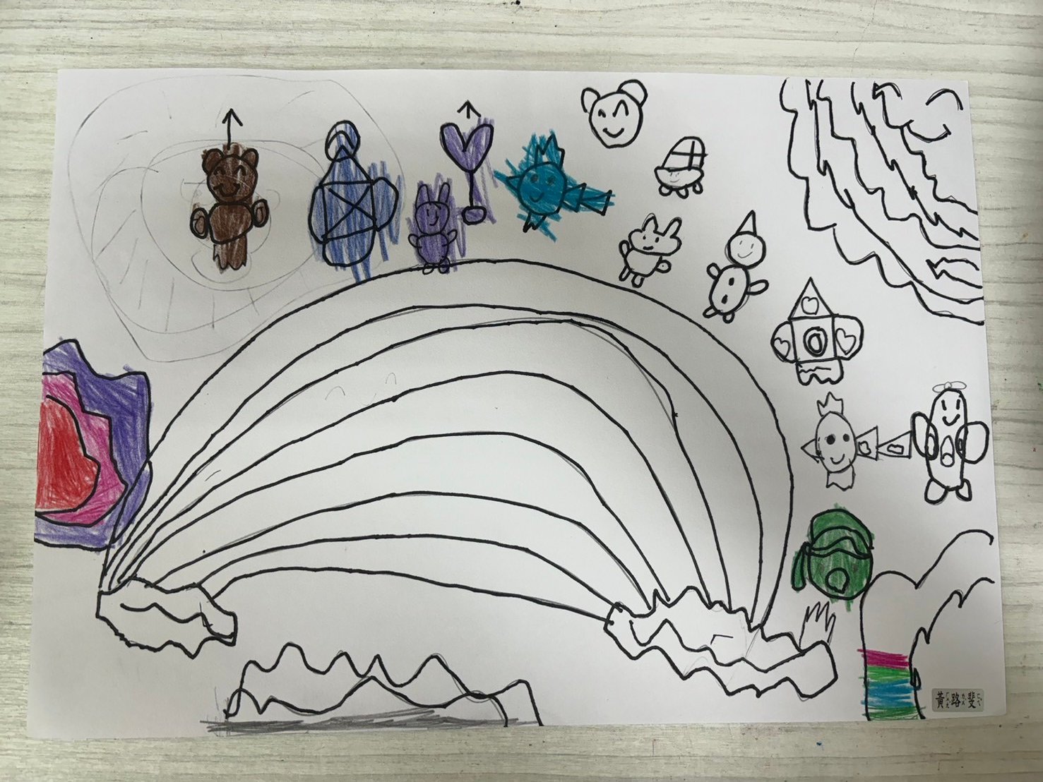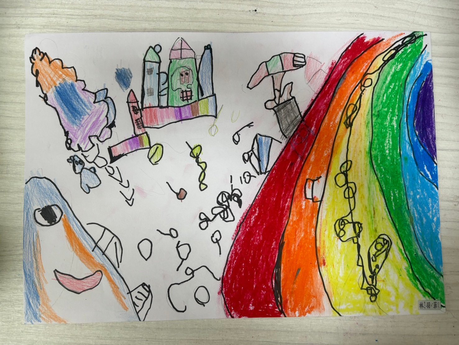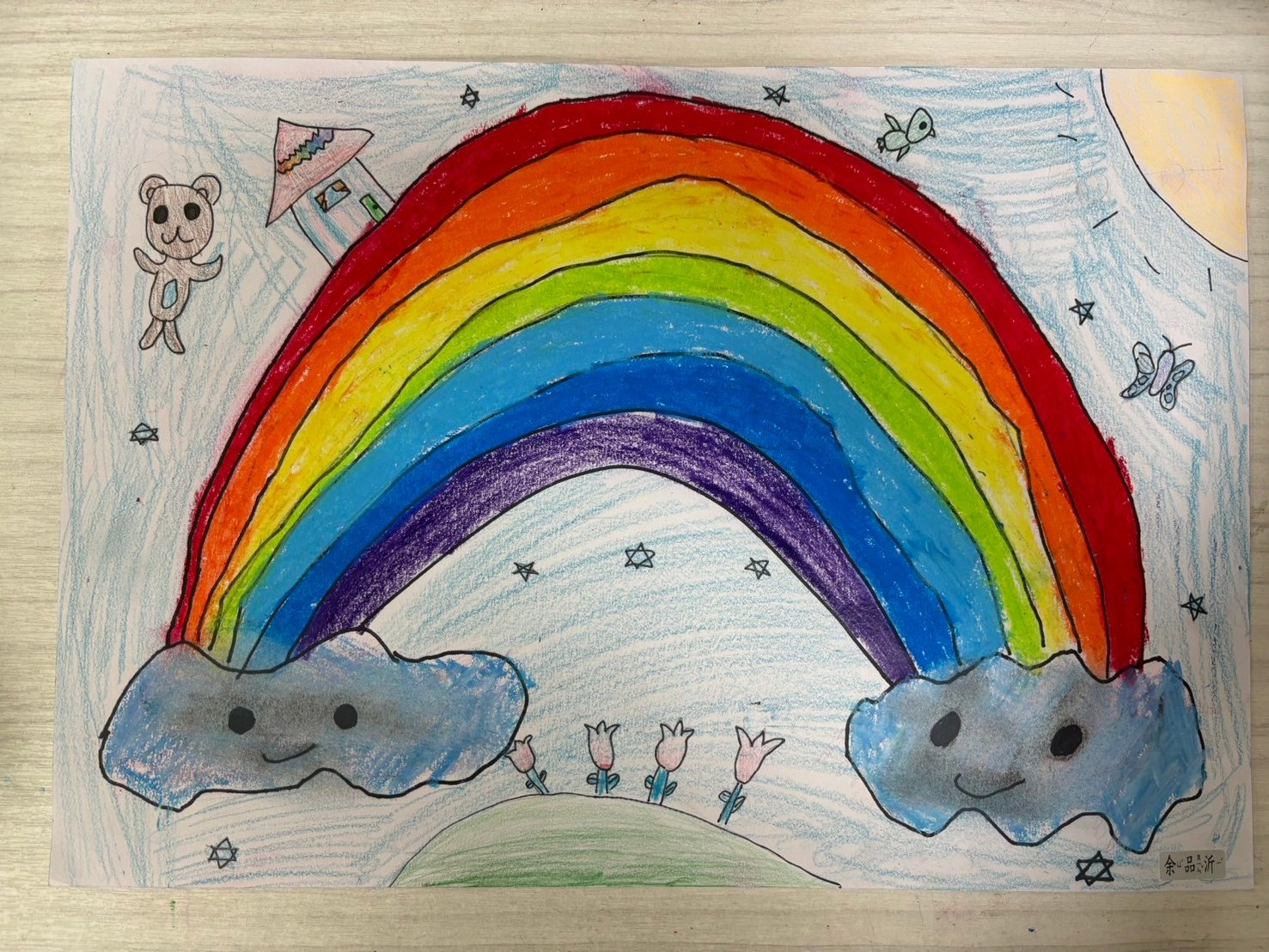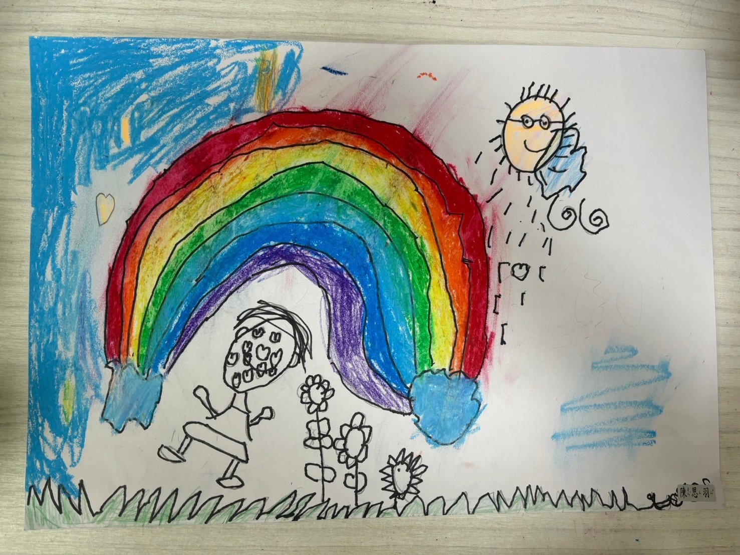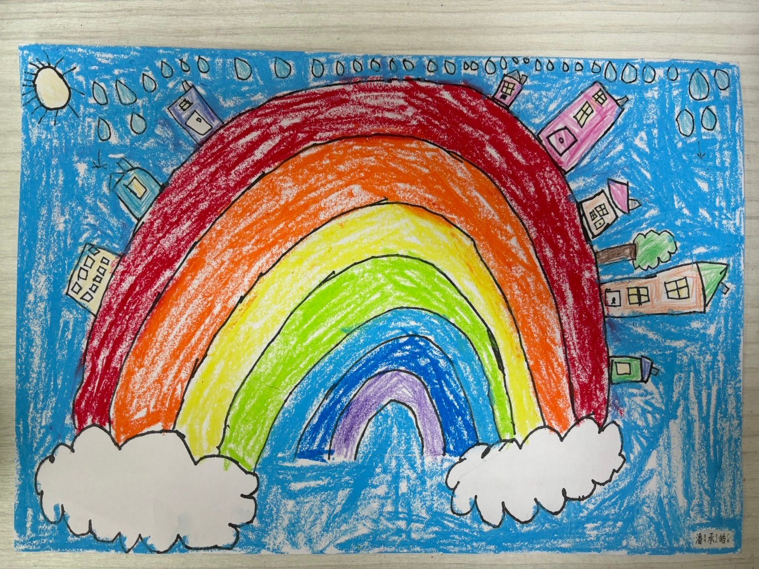 認識蠟筆的特性後,孩子這次運用蠟筆、色鉛筆和簽字筆完成一幅可愛的作品:充滿幸福感的彩虹畫