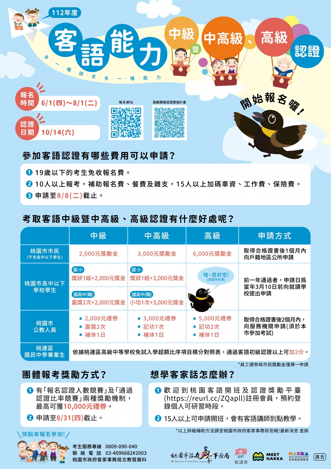 | (二) | 112年度桃園市客語能力認證團體報名獎勵計畫: |