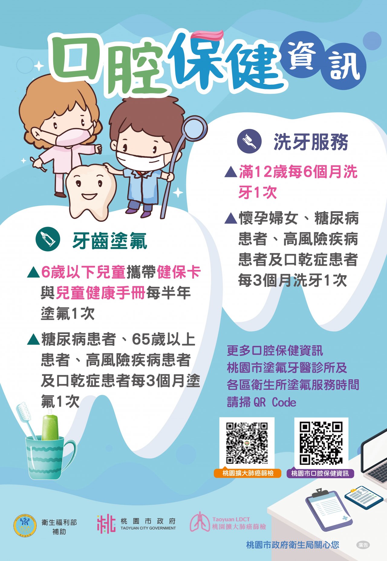 | 二、 | 為提升國人口腔健康照護,提供各年齡層及特殊族群可接受牙齒塗氟及洗牙服務項目;尤其自112年2月1日起,6歲以下兒童牙齒塗氟保健服務須攜帶健保卡及兒童健康手冊,若未攜帶特約醫事服務機構將不提供此服務。 |
