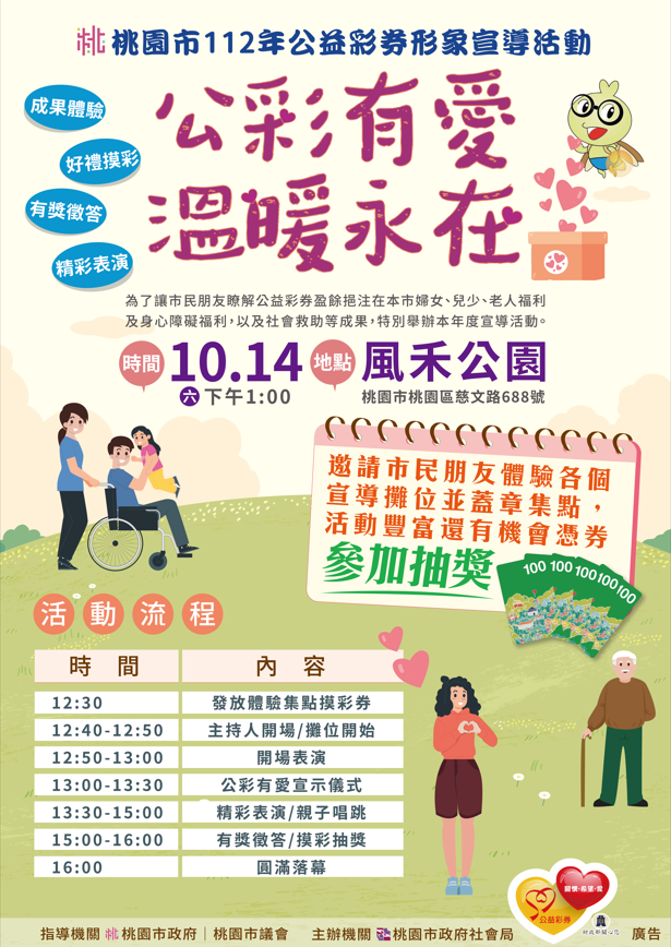 本次活動訂於112年10月14日(星期六)下午1時至下午4時,假桃園區風禾公園辦理,現場規劃各社福機構及社會團體設攤,透過攤位體驗互動展現公彩成果,活動當天另有精彩表演、親子帶動跳和摸彩活動,歡迎踴躍參加。