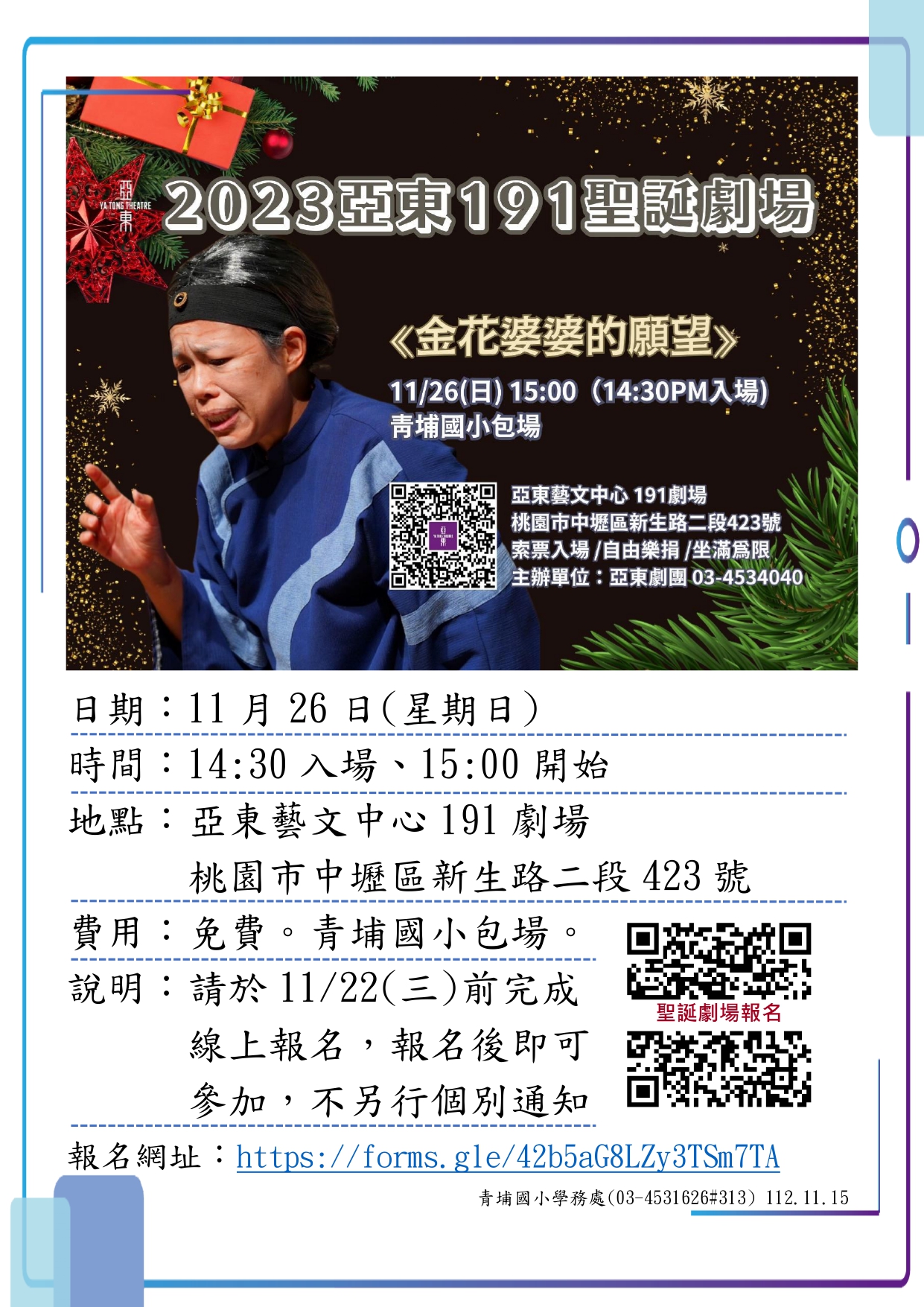 費用:免費。青埔國小包場。