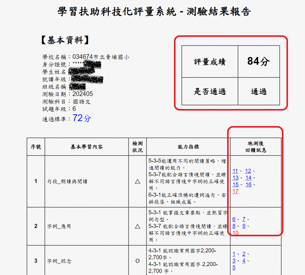 5. 進入學生個人測驗結果報告頁面, 可以點取了解施測後回饋訊息