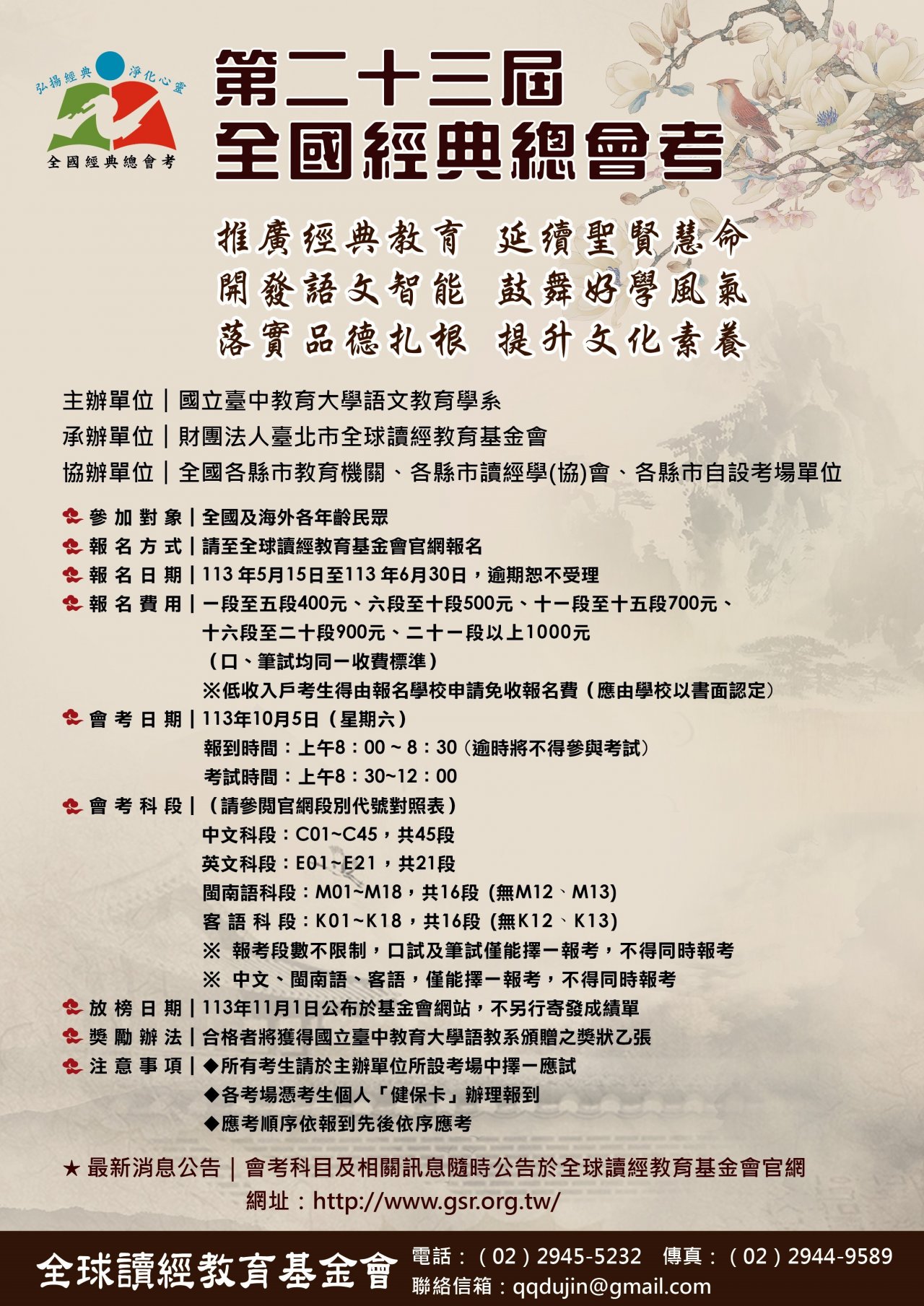 轉知財團法人臺北市全球讀經教育基金會辦理「第23屆全國經典總會考海報」