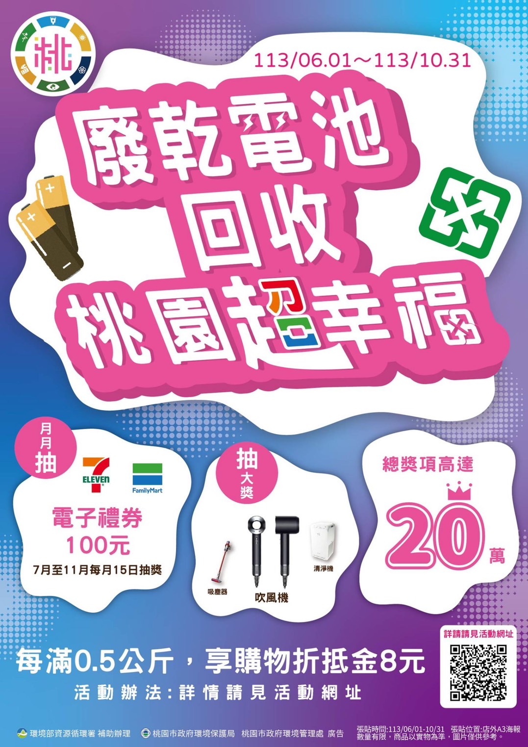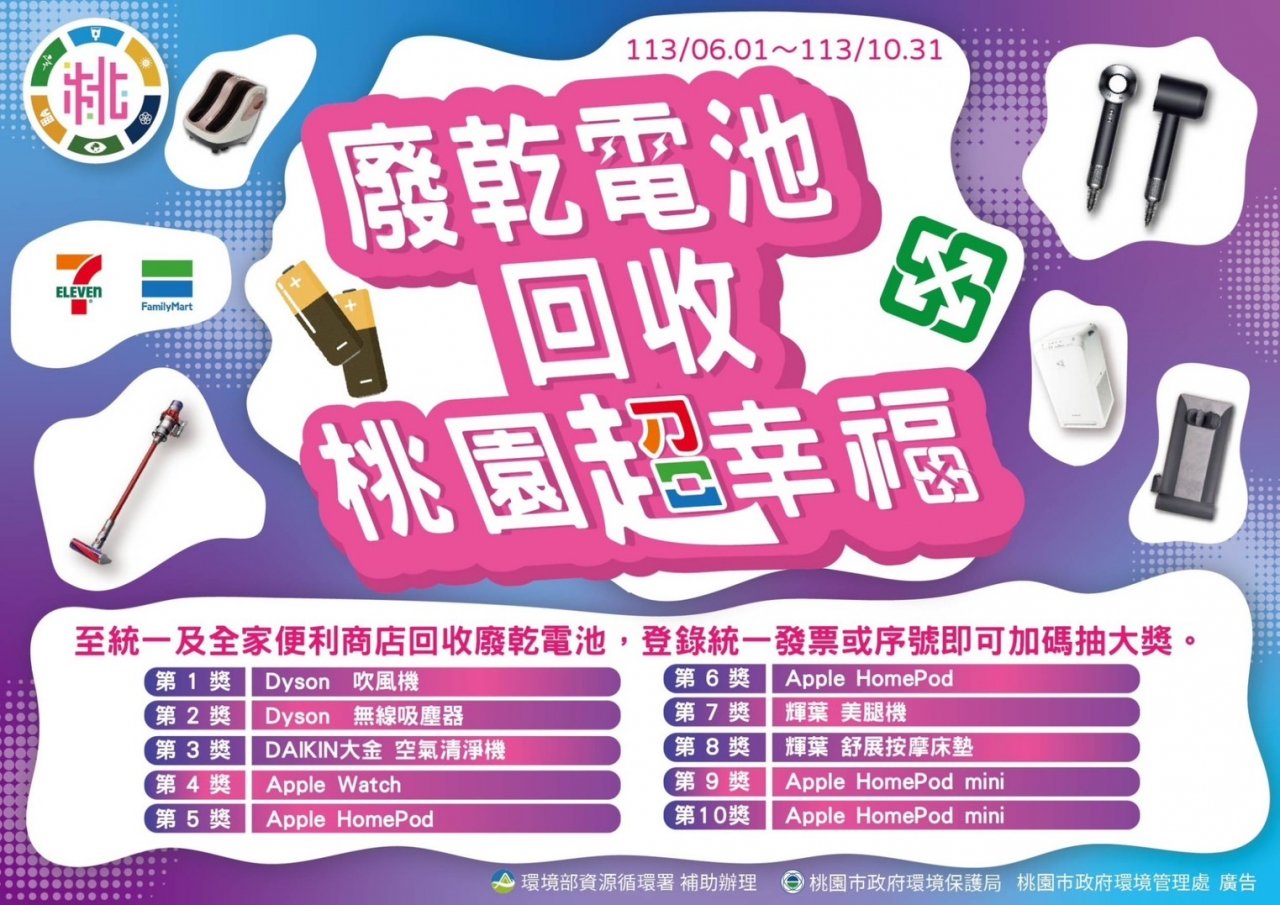 | 主旨: | 有關本局於113年6月1日起至10月31日期間,結合統一超商及全家便利商店辦理「廢乾電池回收 桃園超幸福」廢乾電池回收加碼活動案,惠請廣為宣傳,請查照。 |