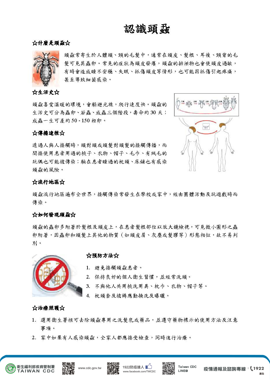| 主旨: | 檢附「認識頭蝨」單張及「頭蝨的防治」各1份,詳如說明,請查照。 |