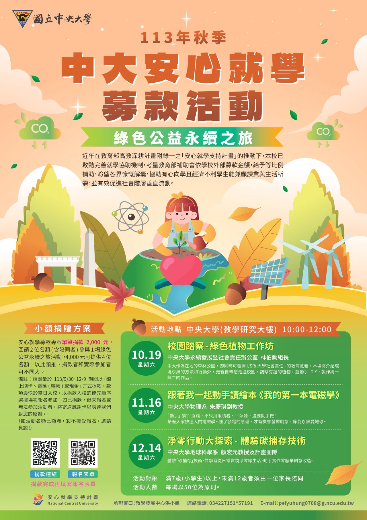 | 主旨: | 本校辦理「113年秋季中大安心就學募款-綠色公益永續之旅」,敬請協助宣傳,詳如說明,請查照。 |