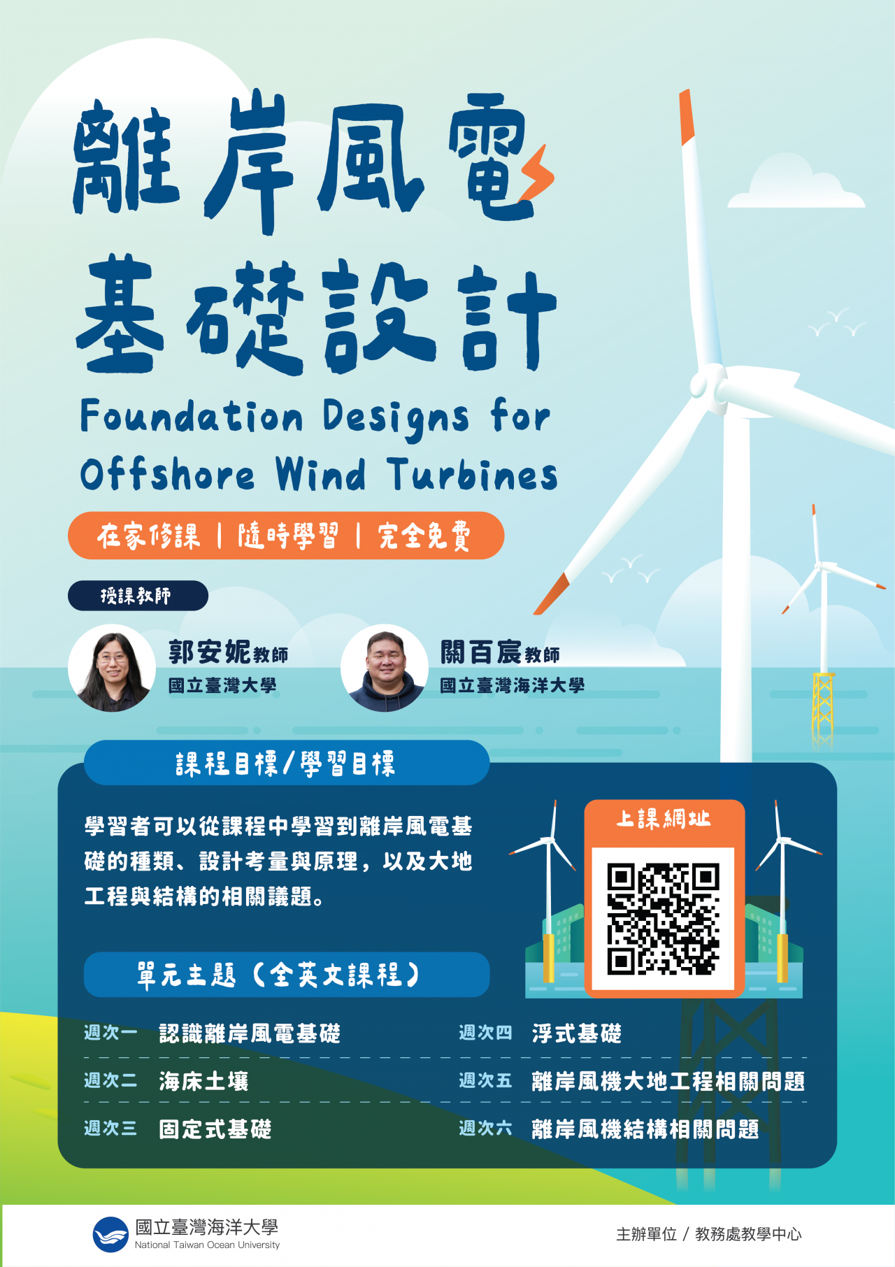 二、 為促進綠能發展,因應全球能源轉型趨勢,該校開設「離岸風電基礎設計」線上課程,希望提升學員對離岸風電基礎知識的理解,協助推動環境永續與綠能教育。