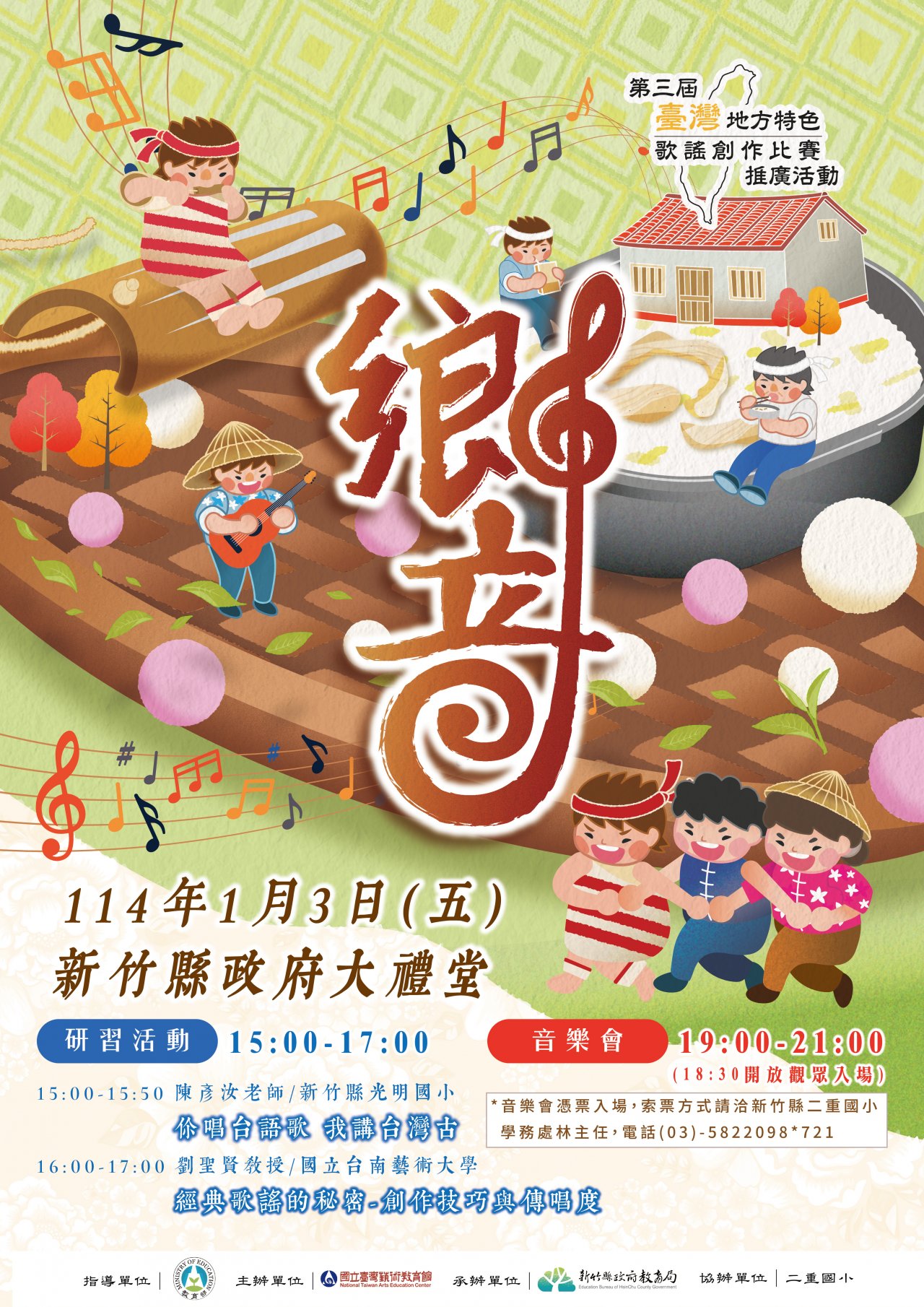 | 主旨: | 轉知國立臺灣藝術教育館辦理第3屆「臺灣地方特色歌謠創作比賽」北區推廣音樂會(含漢詩吟唱)及研習課程活動,請貴校踴躍參加,請查照。 |