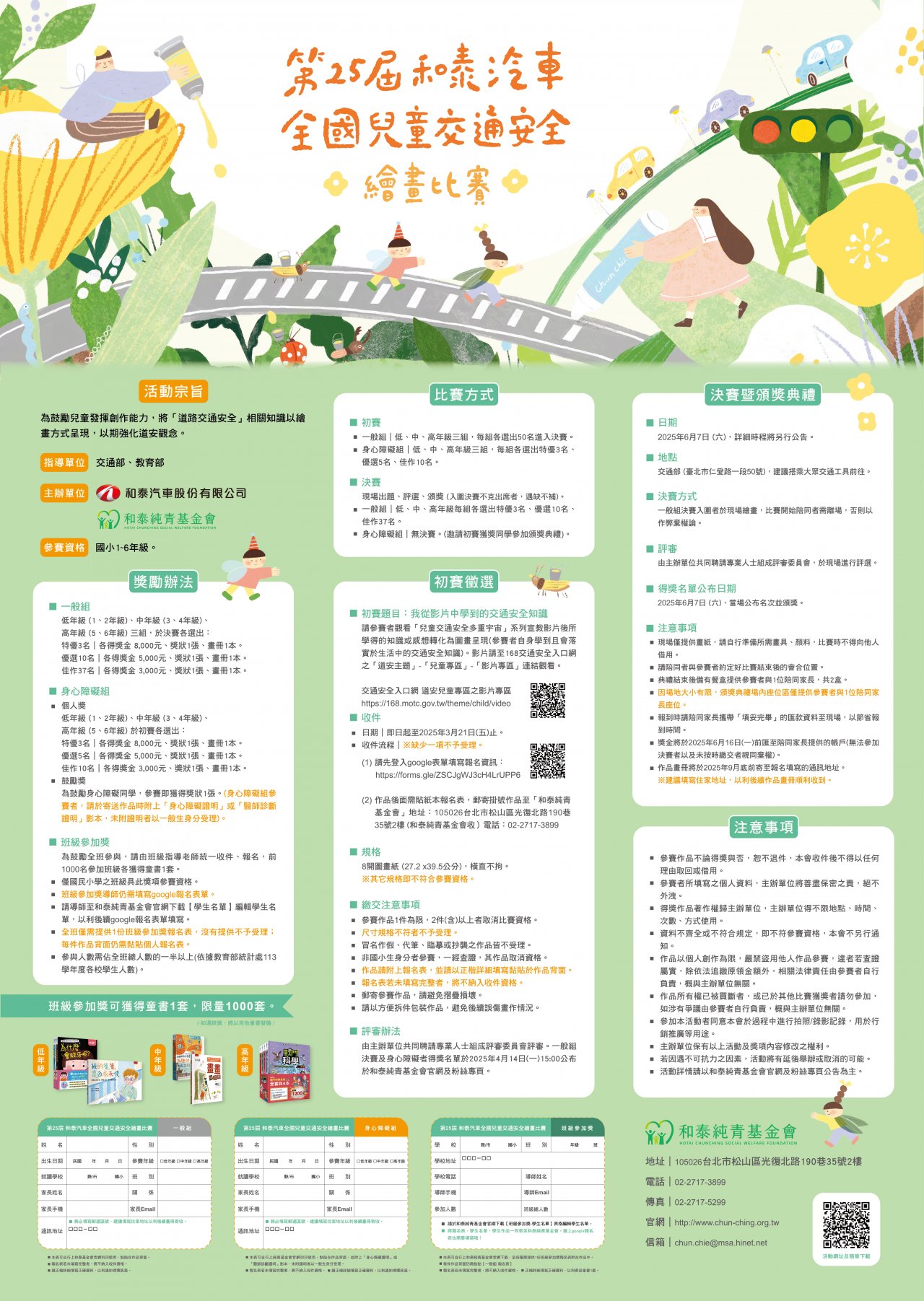 主旨:函轉財團法人和泰純青社會福利基金會辦理「第25屆和泰汽車全國兒童交通安全繪畫比賽」活動訊息一案,請查照。