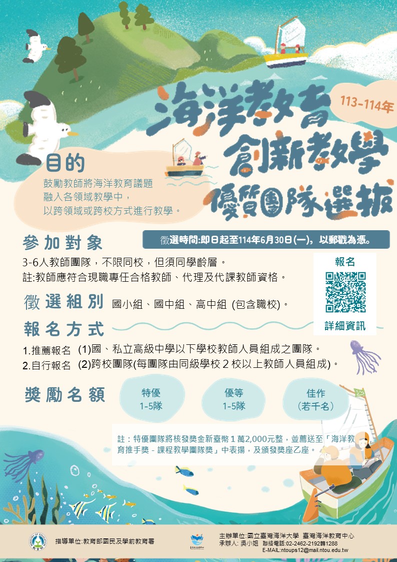 | 主旨: | 檢送「113-114年海洋教育創新教學優質團隊選拔」實施計畫及宣傳海報各1份,詳如說明,請查照。 |