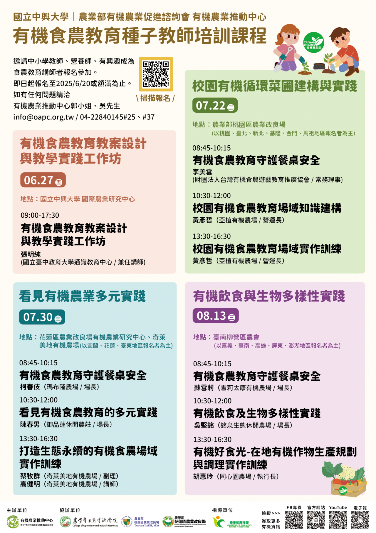 | 2、 | 114年7月22日(星期二)08:45-17:00,「有機食農教育守護餐桌安全」、「校園有機食農教育場域知識建構」、「校園有機食農教育場域實作訓練」,課程地點:農業部桃園區農業改良場。 |
