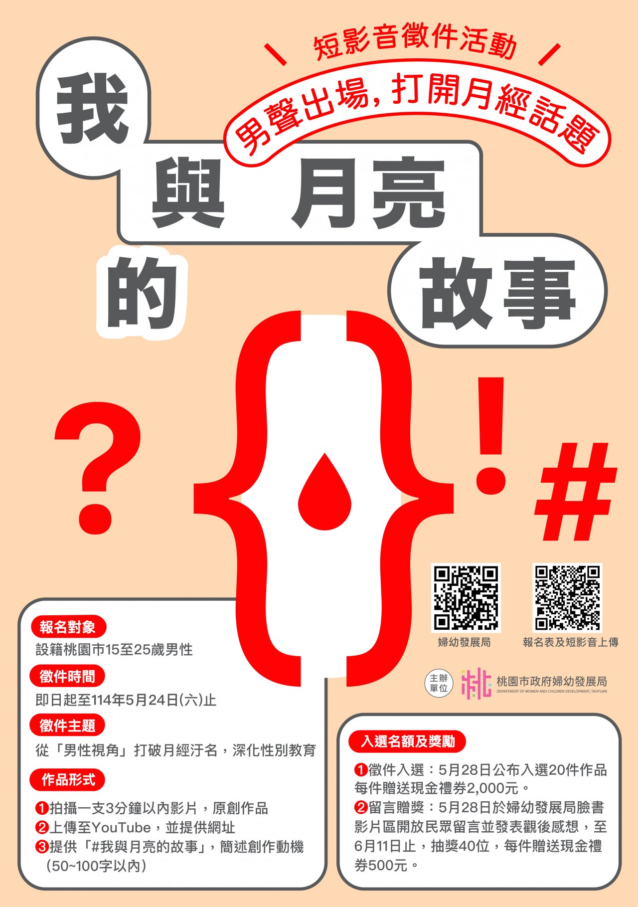 | 二、 | 為推動性別友善與經期平權,該局擬透過教育倡議與空間實踐雙軌並進,鼓勵桃園市年輕男性及學子透過短影音創作,參與月經平權對話,促進社會對月經議題的理解與支持,擬辦理計畫如下: |
