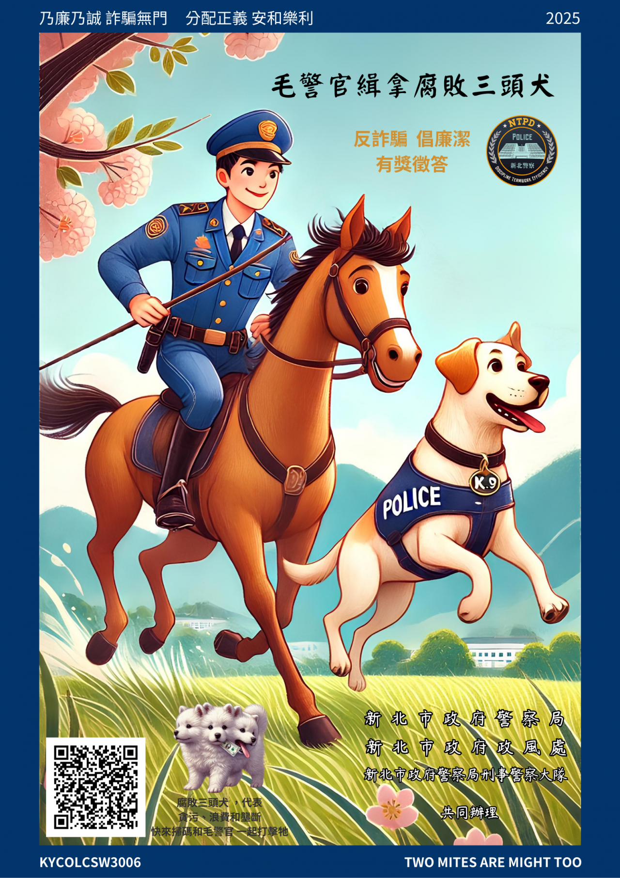 主旨:函轉教育部國民及學前教育署有關新北市政府警察局辦理「『毛警官緝拿腐敗三頭犬』反詐騙倡廉潔有獎徵答活動」,詳如說明,請查照。