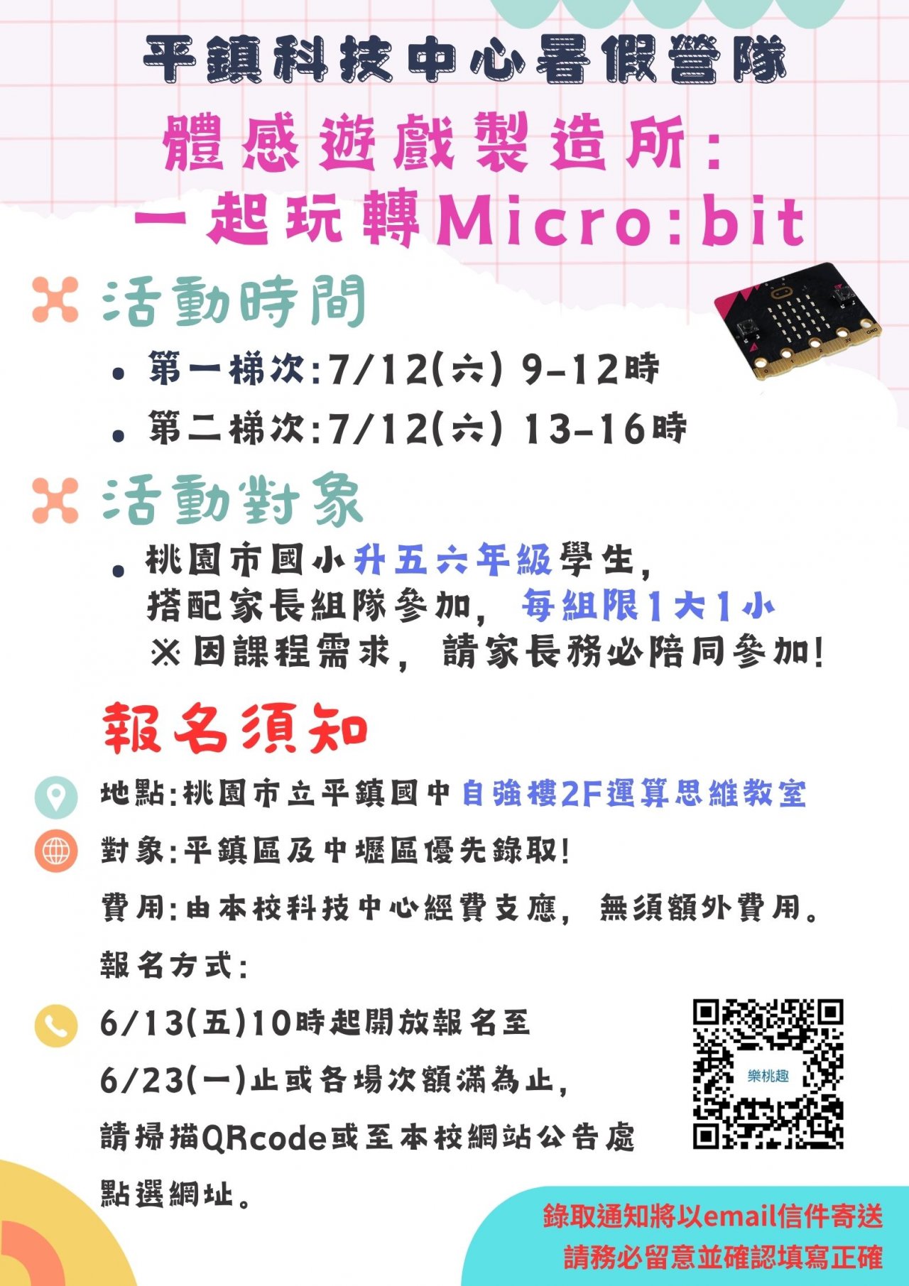 | 八、 | 活動須審核,報名成功非即錄取,本活動將於6/25(三)中午12時前,於平鎮國中官網與本中心粉絲專頁公告錄取名單,並同步寄送email至家長信箱。 |