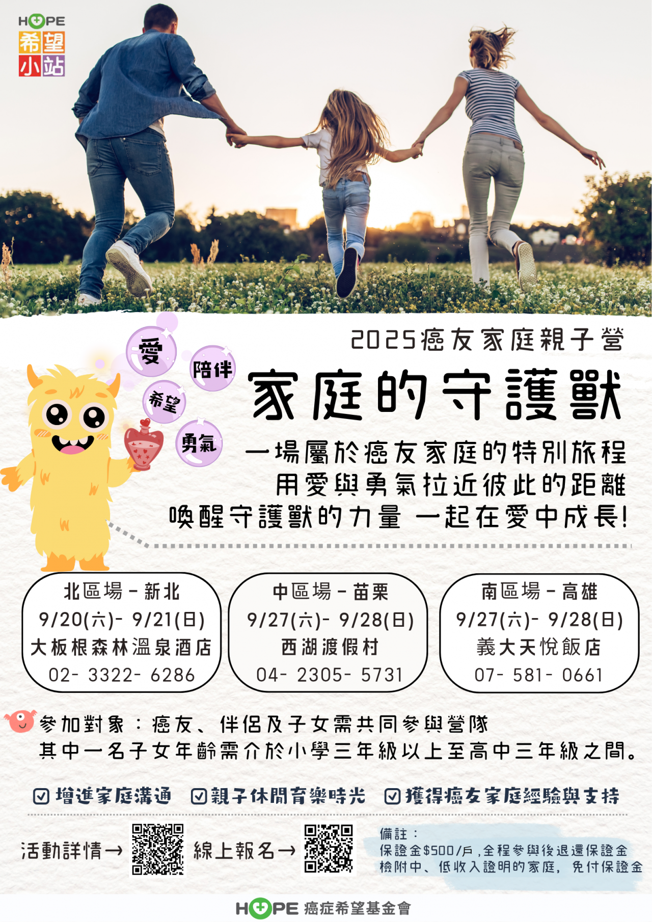 | 主旨: | 函轉財團法人癌症希望基金會「癌友家庭親子營」活動海報及報名簡章,請貴局校協助轉知活動相關資訊,請查照。 |