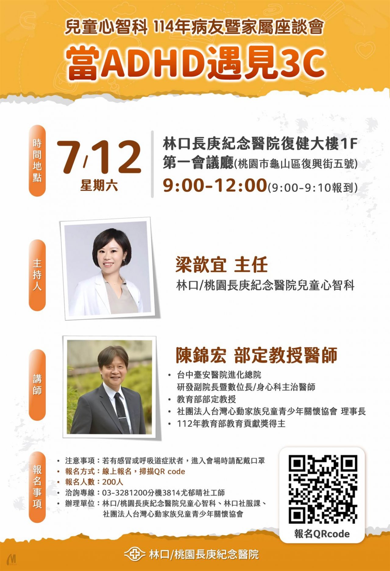 轉知長庚醫療財團法人林口長庚紀念醫院(以下稱長庚醫院) 辦理兒童心智科病友暨家屬座談會「當ADHD遇見3C」一案