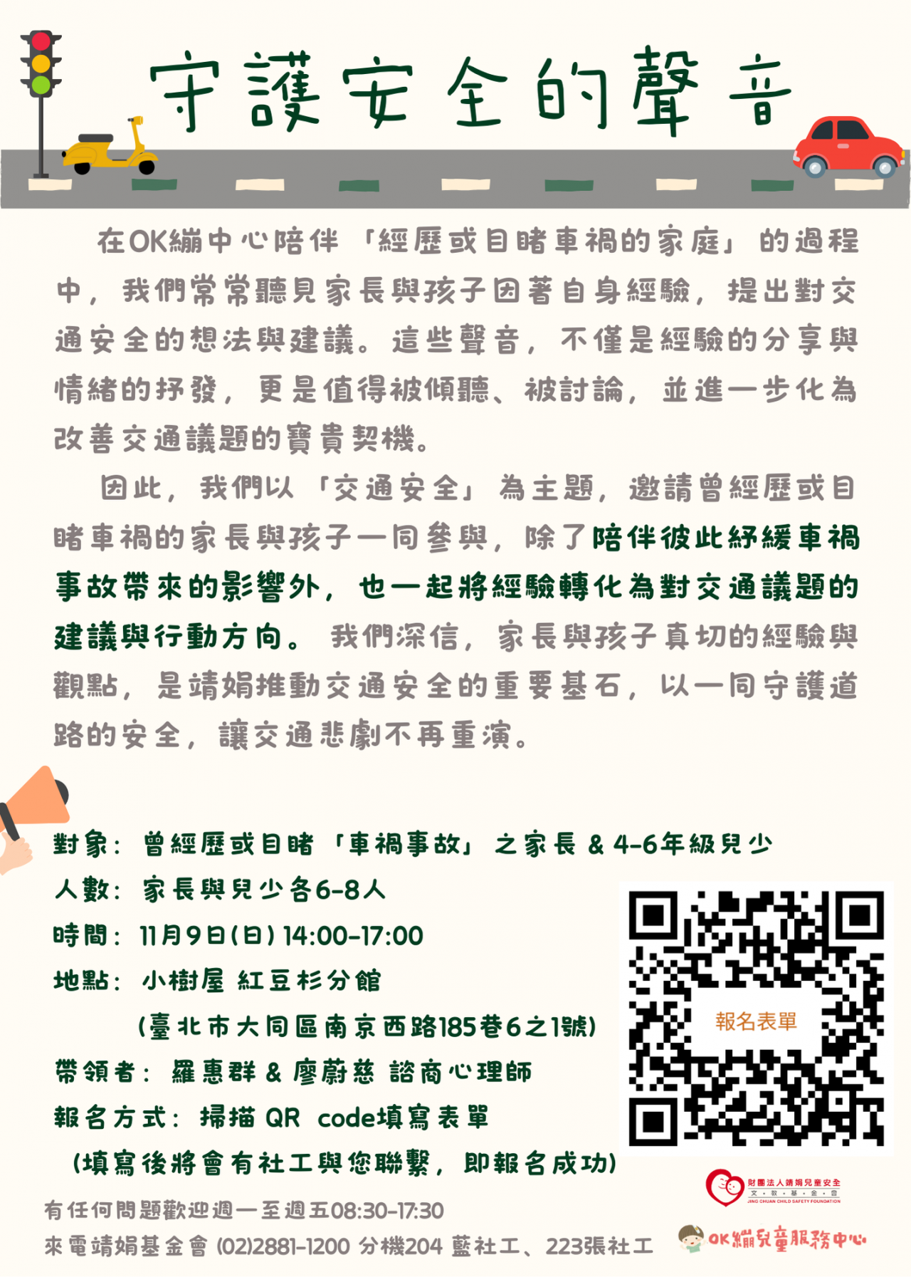 主旨:函轉財團法人靖娟兒童安全文教基金會OK繃兒童服務中心辦理114年度「聽見安全的聲音-交通議題對話框」,請查照。 說明: 一、依據財團法人靖娟兒童安全文教基金會(下稱該會)114年9月8日114靖娟北總字第1140000369號函辦理。 二、該會以「交通安全」為活動主題,邀請曾經歷或目睹車禍之家長及兒少共同參與,期協助家長及兒少紓緩事故影響之餘,並凝聚意見並討論交通環境的改善方向。 三、檢附旨揭活動宣傳單1份。