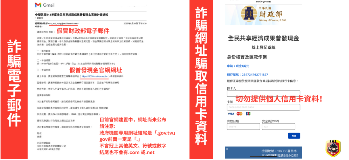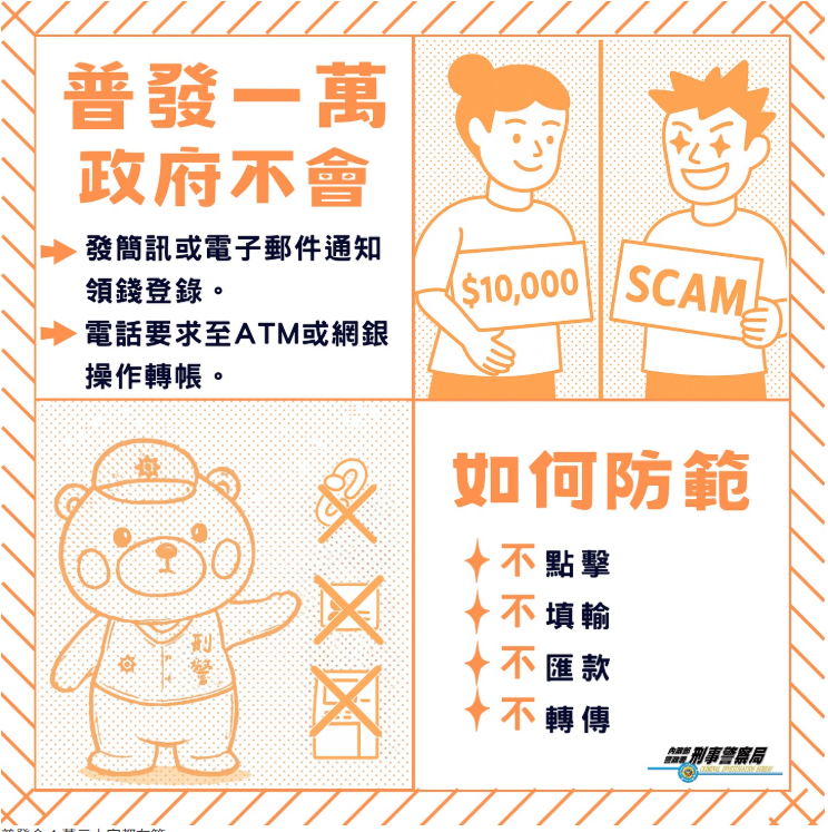 主旨:轉知各校加強「普發現金」詐騙防制相關宣導,請查照。 說明: 一、依本府警察局114年10月16日桃警預字第1140142017號函辦理。 二、請透過校內各類媒體傳播、網路媒體貼文及公開集會場合加強推廣旨揭宣導素材,以提升師生及家長之警覺心,避免遭詐騙集團話術誘騙受害。 三、檢附宣導圖卡及文宣素材各1份。