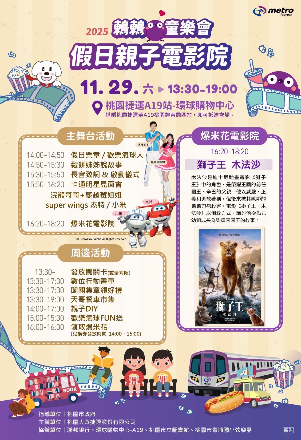 | (四) | 活動內容:假日樂章/歡樂氣球人、鬆餅姐姐說故事、卡通明星見面會(super wings杰特/小米)、爆米花電影院、數位行動書車、闖關集章任務活動、天哥餐車市集等。 |