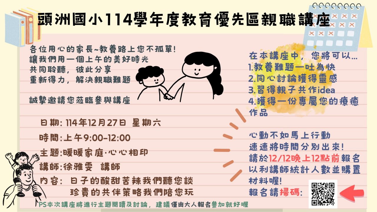 | 八、 | 附上宣傳海報,敬請參考;本講座安排家長討論活動,建議僅由大人報名為主。 |