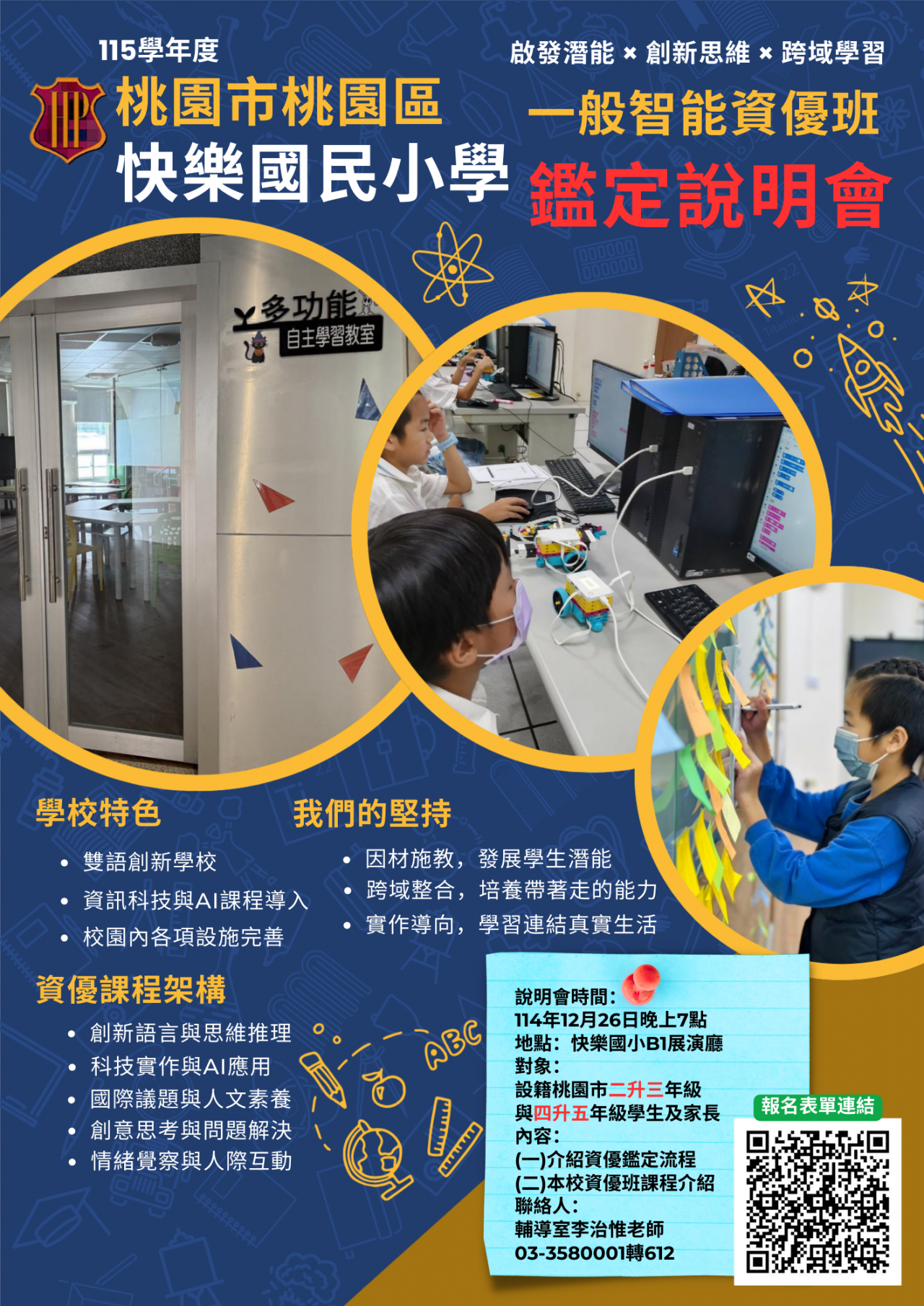 | 主旨: | 有關快樂國小辦理「115學年度國民小學資賦優異學生鑑定家長說明會」一案,詳如說明,請各校所屬二升三及四升五年級學生和家長踴躍報名參加。 |