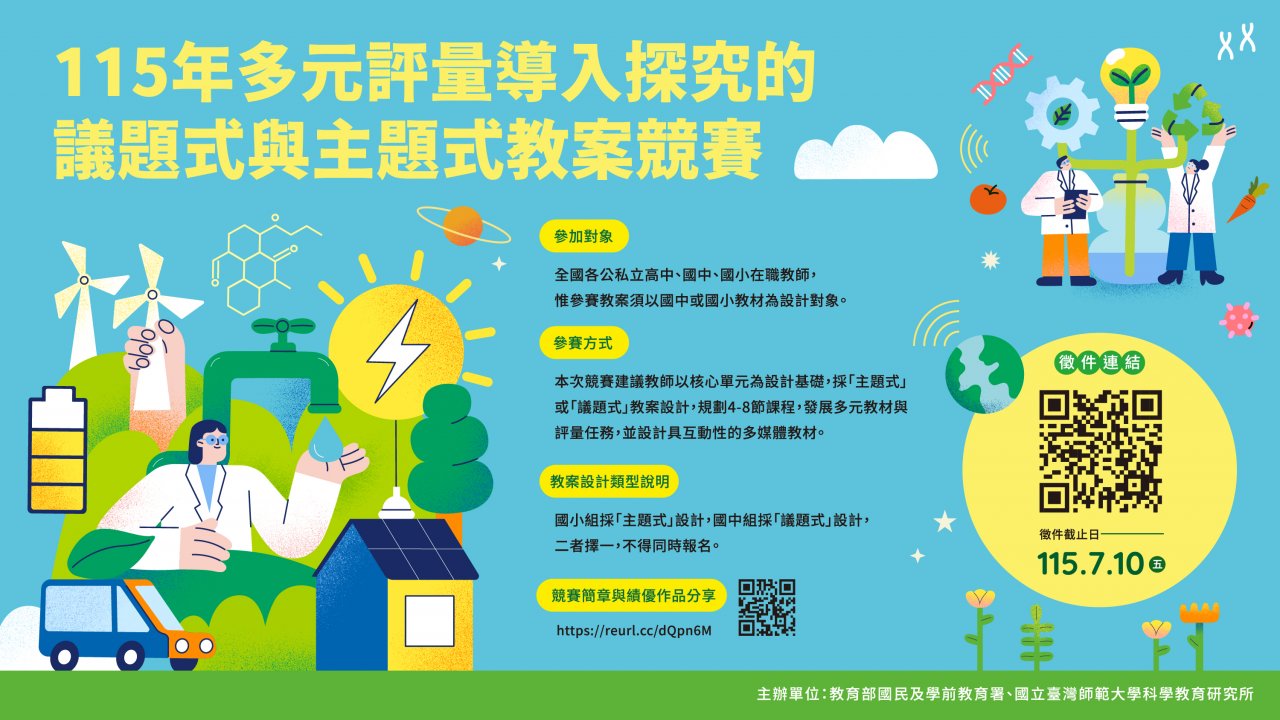 | 主旨: | 函轉國立臺灣師範大學執行教育部國民及學前教育署委辦「多元評量導入探究的議題式與主題式教學教案」競賽徵稿實施計畫案,請查照。 |
