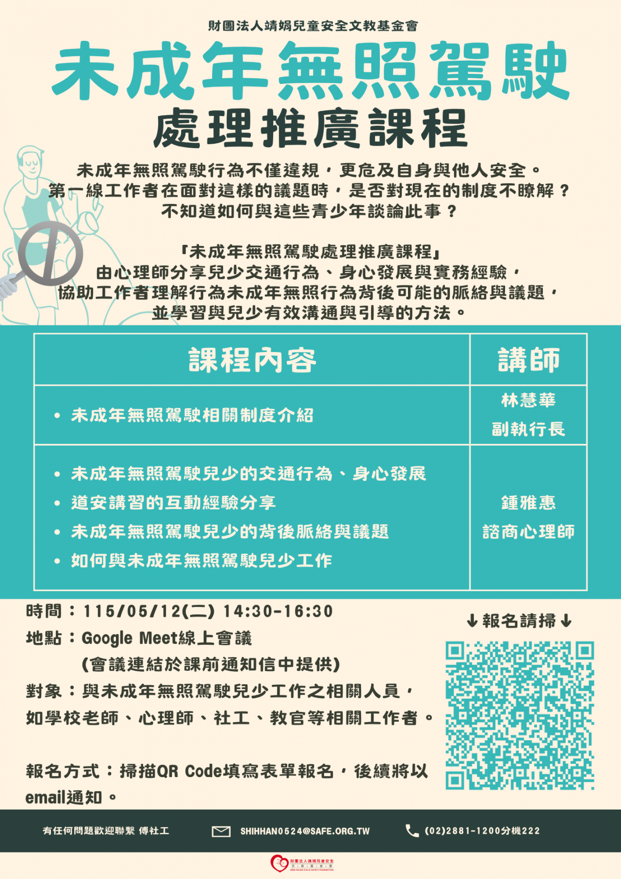 主旨:函轉財團法人靖娟兒童安全文教基金會OK繃兒童服務中心辦理115年度「未成年無照駕駛處理推廣課程」活動宣傳單1份,請查照。 說明: 一、依據財團法人靖娟兒童安全文教基金會(下稱該會)115年3月30日115靖娟北總字第1150000105號函辦理。 二、該會擬以「未成年無照駕駛處理推廣課程」分享未成年無照駕駛兒少之交通行為、身心發展,以及道安講習的授課經驗,讓兒少相關工作者了解未成年無照駕駛兒少,並一同降低違規的發生,請貴校鼓勵教職員踴躍參加。