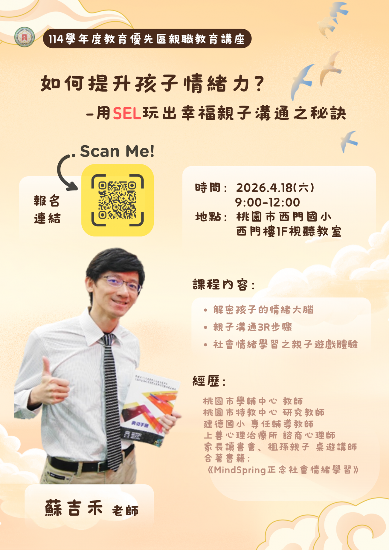 | 三、 | 講師蘇吉禾老師具學輔中心教師及諮商心理師專業背景,長期投入學生輔導與心理健康推廣工作,曾任特教中心研究教師及國小專任輔導教師,並於心理治療所擔任諮商心理師,實務經驗豐富。另受邀至各級學校及機關團體辦理心理健康與情緒教育講座,致力推廣社會情緒學習(SEL),協助親師理解孩子情緒發展,促進良好親子溝通。 |