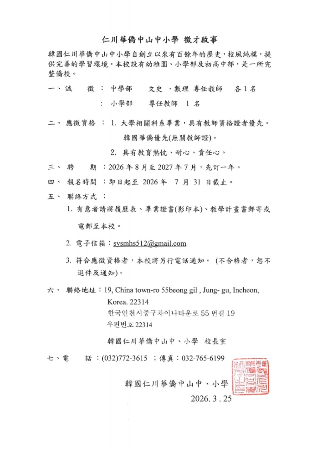 轉知韓國仁川華僑中山中小學徵聘中學部及小學部專任教師一案,請協助公告相關資訊,請查照。